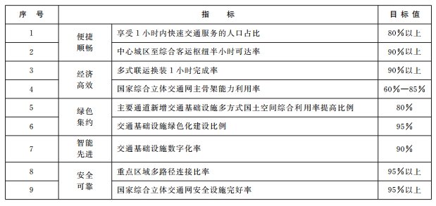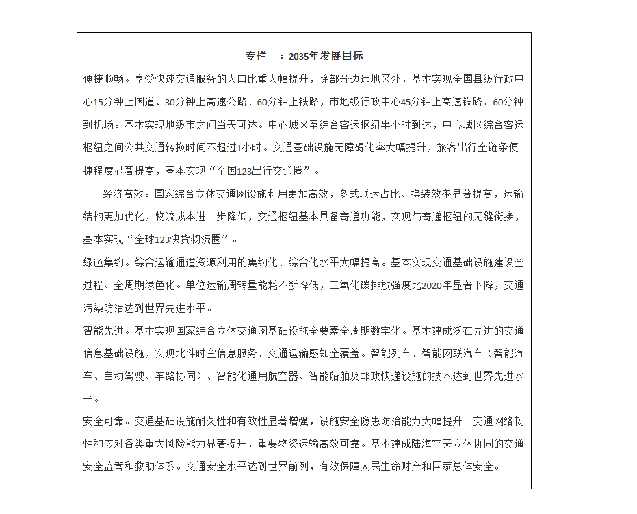 到2035年,基本建成便捷顺畅、经济高效、绿色集约、智能先进、安全可靠的现代化高质量国家综合立体交通网,实现国际国内互联互通、全国主要城市立体畅达、县级节点有效覆盖,有力支撑“全国123出行交通圈”(都市区1小时通勤、城市群2小时通达、全国主要城市3小时覆盖)和“全球123快货物流圈”(国内1天送达、周边国家2天送达、全球主要城市3天送达)。交通基础设施质量、智能化与绿色化水平居世界前列。交通运输全面适应人民日益增长的美好生活需要,有力保障国家安全,支撑我国基本实现社会主义现代化。(见专栏一)(见国家综合立体交通网2035年主要指标表)