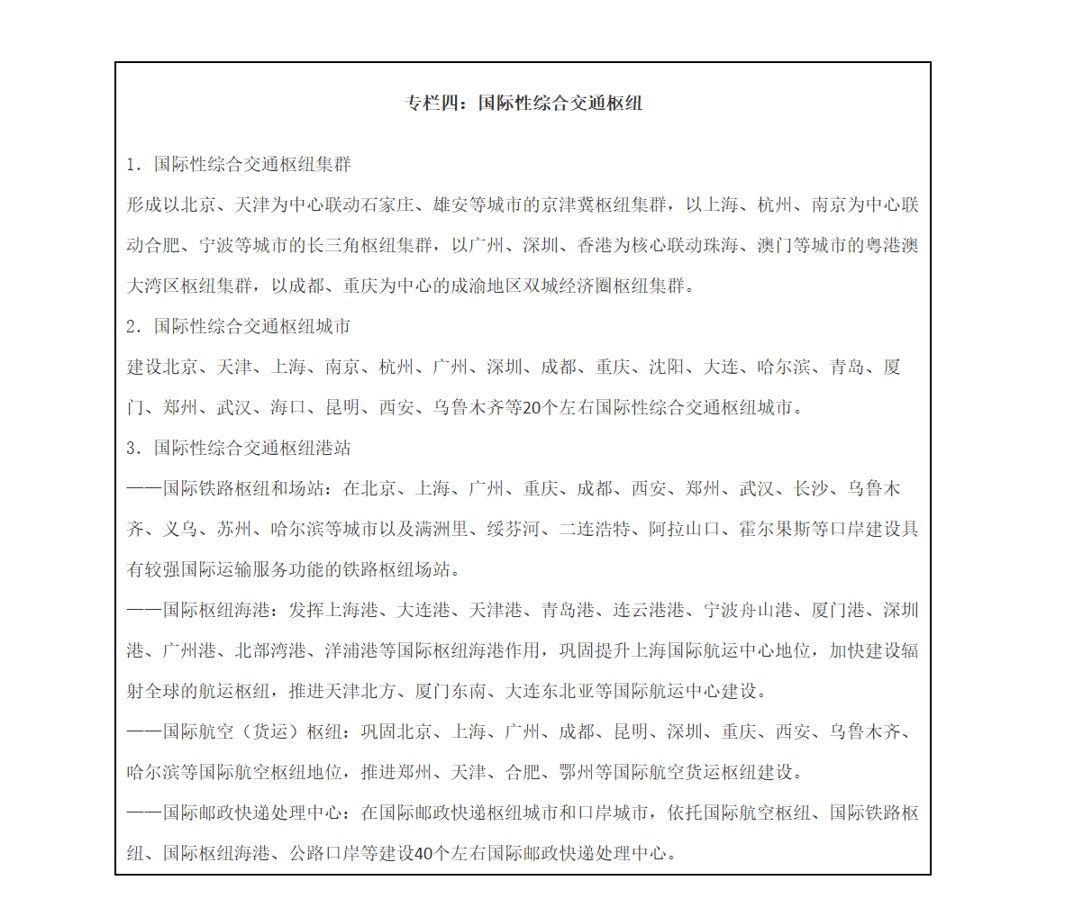 建设综合交通枢纽集群、枢纽城市及枢纽港站“三位一体”的国家综合交通枢纽系统。建设面向世界的京津冀、长三角、粤港澳大湾区、成渝地区双城经济圈4大国际性综合交通枢纽集群。加快建设20个左右国际性综合交通枢纽城市以及80个左右全国性综合交通枢纽城市。推进一批国际性枢纽港站、全国性枢纽港站建设。(见专栏四)